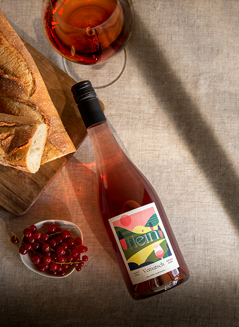 Fleinbeschreibung "Strahlendes Lachsrosa im Glas. Verführerischer Duft nach eingekochten Erdbeeren und gerie­benen Bittermandeln. Erinnert auch an Ribiseln und Granatapfel. Die lebendig-fri­sche Säure bringt Balance. Am Gaumen Hagebutte, Rhabarber und roter Apfel."